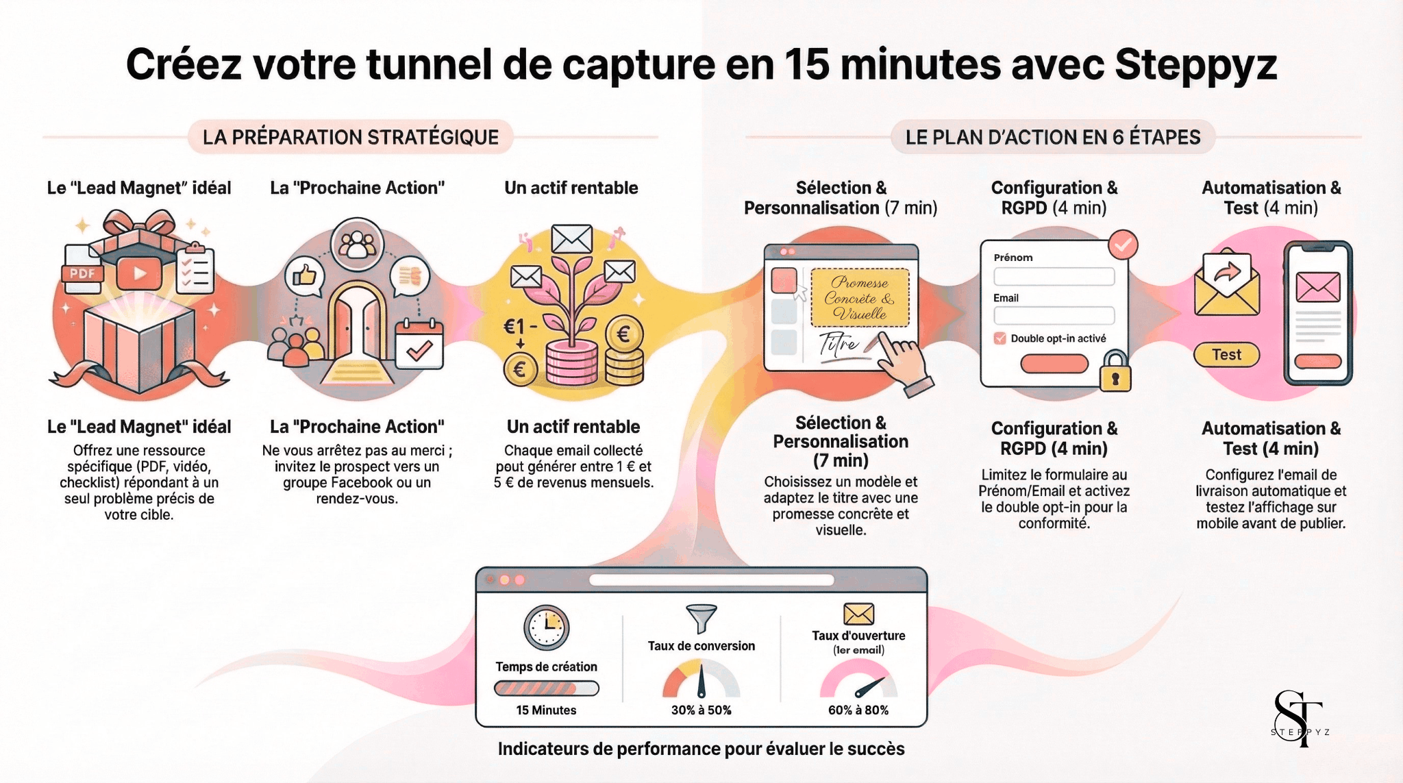 La bonne nouvelle : avec Steppyz, créer un tunnel de capture professionnel ne prend pas une journée. Ça prend 15 minutes. On vous montre exactement comment, étape par étape.